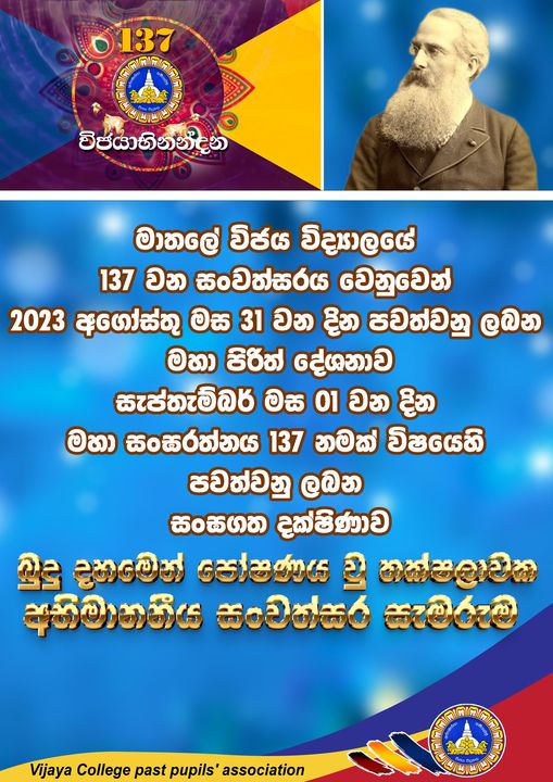 ශ්රීමත් හෙන්රි ස්ටීල් ඕල්කොට් තුමා අනුස්මරණය කරන්නේ පෙබරවාරි 17 වන දායි. 1880 දී එතුමා ලංකාවට ගොඩවන්නේ ගාලු වරායෙනි. ඒ බෞද්ධයකු වී මෙරටට සේවය කිරීම පිණිසය. කොළඹ පරම විඥානාර්ථ සමාගම ආරම්භ කරමින් (Theosophical Society) බොහෝ කටයුතු වල යෙදෙන ඔහු මෙරට බෞද්ධ දරුවන්ට ඉංග්රිසියෙන් ඉගෙන ගැනීම සඳහා පාසල් ආරම්භ කිරීමේ පුරෝගාම් මෙහෙවරක් ඉටුකළේය. කොළඹ මරදානේ පිහිටවූ ආනන්ද විද්යාලය 1886 ආරම්භ කෙරෙන්නේ එලෙසය. එම වසරේම එනම් 1886 දී මාතලේ විජය විද්යාලය ආරම්භ වන්නේ බෞද්ධ දානපතියන්ගේ පිහිටෙනි. රට පුරා පරම විඥානාර්ථ සමාගමේ අනුග්රහයෙන් පාසල් රාශියක් බිහිවෙන අතර මහනුවර ධර්මරාජ විද්යාලය ආරම්භ වන්නේ 1887 දීය එනම් ආනන්ද හා මාතලේ විජය විද්යාලය ආරම්භ වී වසරකට පසුවය. ගාල්ලේ මහින්ද විද්යාලය ඊටත් වසර තුනකට පසු එනම් 1890 දී ආරම්භ කරන්නේ එම බෞද්ධ ව්යාපාරයේම උනන්දුව මතය. එසේ විශාල බෞද්ධ පාසල් ප්රමාණයක් ශ්රීමත් හෙන්රි ස්ටීල් ඕල්කොට්තුමා නායකත්වය දුන් Theosophical Society හරහා ඉදිවීම විශේෂයකි. මා මේ කීමට යන්නේ එම පාසල් අතර කැපී පෙනෙන පාසලක් බවට කොළඹින් පිටත පැවති මාතලේ විජය විද්යාලය මාර්තු මාසයේ දිගු කලකට පසු තම නිවාසාන්තර මළල ක්රීඩා උත්සවය පැවැත්වීමට සූදානමින් සිටී. ලංකාවේ කිසිදු බෞද්ධ පාසලක දක්නට නැති නිවාස හතරක් මෙම විද්යාලයේ දැකිය හැක. එනම් මෙරට බිහිවූ අග්රගන්ය පාසල් හතරක ශ්රි නාමයන් එම නිවාස හතරේ නාම කරණයට භාවිතා කිරීමයි. එය කවදා කවුරු කෙළෙස කළාද යන්න මෙම ලිපිය ලියන මම නොදන්නා බව අවංකවම මෙහි සටහන් කළ යුතුය. එහෙත් කීර්තිමත් විදුහල්පතිවරයකු වූ ඊ.එම්.සී. අමුණුගම මහතාගේ සේවාකාලයේ වාර්ෂිකව පළ කර ඇති Vijaya නම් වූ සඟරාව ඉතිහාස ගත කරුණු ගණනාවක් අනාවරණය කරයි. 1957 - 1958 වසර සඳහා ප්රකාශිත 'විජය' නමින් වූ සඟරාවේ මෙම නිවාස හතර ගැනම ලියවී තිබේ .ඒ ඒ නිවාස ලබා ගත් ජයග්රහන,නිවාස භාරවූ ගුරුවරු නිවාස නායකයින් හා නිවාසවල සුවිශේෂීතාද දක්වා තිබේ. ඒ අනුව 1950 දසකයේදී විජය විද්යාලයේ නිවාස නම් වී තිබුනේ ආනන්ද නාලන්ද ධර්මරාජ මහින්ද වශයෙන් යයි නිගමනය කළ හැකිය. නමුත් ඒවා එසේ කිරීමට මුල් වූ පුද්ගලයින් හා එසේ කළ මුල් අවුරුද්ද පිළිබඳව දන්නා වයස්ගත ආදි සිසුන් හෝ ගුරු භවතුන් සිටිනවා නම් මේ පිළිබඳව අපව දැනුවත් කරන්නැයි කාරුණිකව ඉල්ලමි. මෙවැනි දෙයක් හෝ හෙළි කර ගැනීමට අවකාශය ලැබුනේ අපගේ කීර්තිමත් ගුරු උතුමෙකු වූ ලුතිනන් කර්නල් අමරදාස මහතා හා අමරදාස ටීචර් ට පින්සිදු වන්නටය. කීර්තිමත් නාම ශේෂගත එම සදාදරණීය ගුරු උතුමන් අද ජීවතුන් අතර නැත.එහෙත් ඔවුන් මෙම විද්යාලයට දැක්වූ ආදරය නිසාම එකල ඔවුන් අතට ලැබුණු සියලු ලේඛන සුරක්ෂිත කොට ඇත. ඔවුනගේ බාල පුතු අප විද්යාලයේ ආදි ශිෂ්යයෙකි.මංජුල මාකාවිට මල්ලී එම පොත් පත් තවමත් ආරක්ෂිතව පවත්වා ගැනීම නිසා අපට එක් ඉතිහ